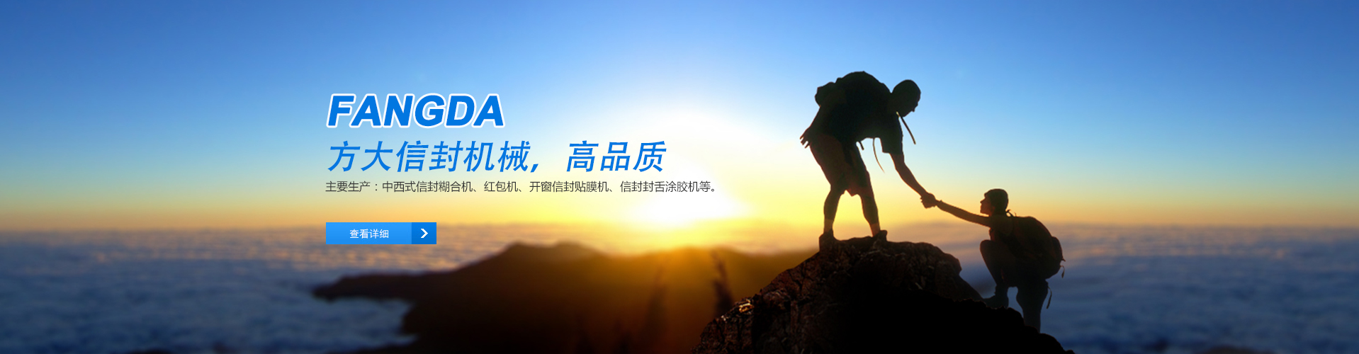 瑞安方大信封機械有限公司,是專業生產信封機糊合設備系列產品的企業,主要產品有:中西式信封糊合機、紅包機、開窗信封貼膜機、信封封舌涂膠機等。實力來自規模,品質源自專業。我廠擁有專業老練的工程設計人員,經驗豐富的生產安裝人員,嚴謹認真的質量檢驗人員,從而保證了所生產機械的優良品質。此外,我廠也將從技術上、性能上不斷改進提高,以更好的滿足客戶的需求。“客戶至上,服務為本”是我廠長期一貫的服務理念,從安裝、測試、保養、維修等售后服務,我們會給予客戶充足的信息資訊與技術支持,因此在業界獲得良好的口碑及信譽,您的滿意是我們的榮耀!歡迎您來電查詢、來人參觀,我們一定能給你滿意的答復!秉承“顧客至上,銳意進取”的經營理念,堅持“客戶為先”的原則為廣大客戶提供溫馨的服務。歡迎惠顧!